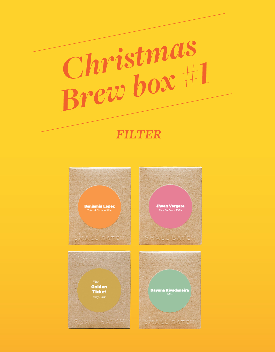 Filter (4 x 250g)– All Three different 250g bags of our Brews of Christmas Week #1 release single producer lots (our heavy hitters!) roasted for filter brewing and 250g of our daily filter blend, The Golden Ticket.